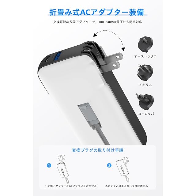 【旅行にはこの1台で十分】 折畳み式のACプラグを装備し、開いた状態ではコンセントに差し込んで充電器として使用でき、収納すれば携帯充電器として使用できます。イギリス、ヨーロッパ、オーストラリアの電源変換プラグも付属しており、海外でも安心して充電できます。電源ソケットとタイプCケーブルが一体型になり、充電器とケーブルを別々に持ち運ぶ必要がありません。