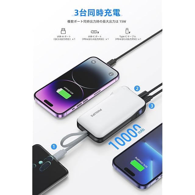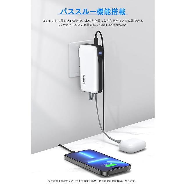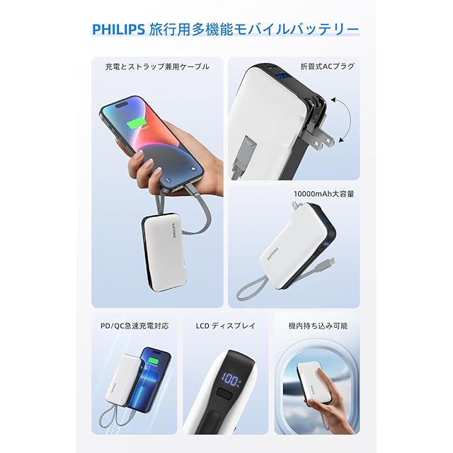 商品名:Philips(フィリップス) モバイルバッテリー コンセント一体型 10000mAh ACプラグ付き 大容量 携帯充電器 PD 20W出力 3台同時充電 折りたたみ式/Type-Cケーブル内蔵/パススルー機能/ディスプレイ搭載/アダプター変換可能 PSE認証済 ホワイト DLP4350CW