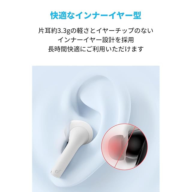 耳にすっぽり収まるフィット感:ノイズキャンセリング機能搭載のSoundcoreイヤホン史上最小サイズを実現。小型軽量設計のため、耳にすっぽりと収まり抜群のフィット感で装着いただけます。