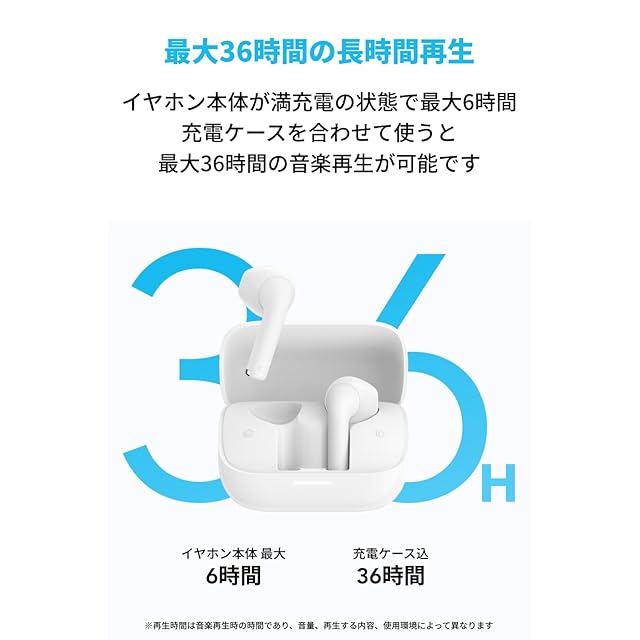 最大36時間の長時間再生:イヤホン本体が満充電の状態で最大6時間、充電ケースを合わせて使うと、最大36時間の音楽再生が可能。また10分間の充電で約2時間の再生が可能な短時間充電にも対応しました。