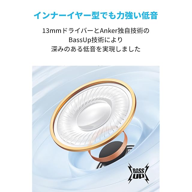インナーイヤー型でも力強い低音: 13mmドライバーとAnker独自技術のBassUp技術により、深みのある低音を実現しました。
