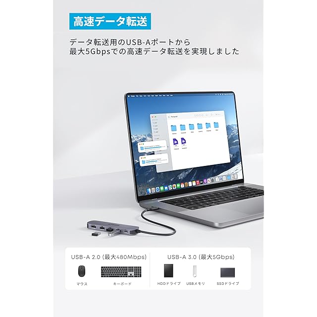 高速データ転送:データ転送用USB-Aポートから最大5Gbpsでの高速データ転送を実現しました。
