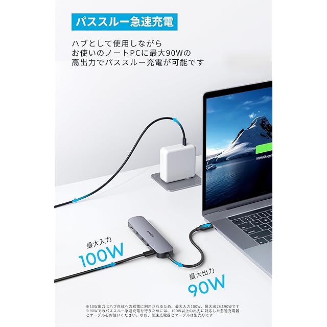 パススルー急速充電:ハブとして使用しながらお使いのノートPCに最大90Wまでの高出力でパススルー充電が可能です。(※90Wでのパススルー急速充電を行うためには、100W出力に対応した急速充電器とケーブルをお使いください。なお、急速充電器とケーブルは別売りです)