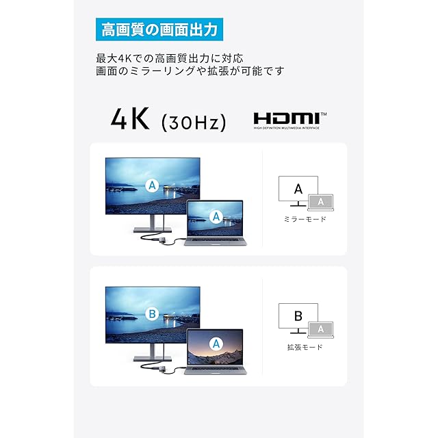 高画質の画面出力:HDMIポートを使用して、最大4K (30Hz)の鮮明な画像出力が可能です。