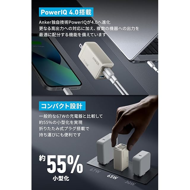 コンパクト設計: 一般的な67W出力以上の充電器に比べ、約55%小さなコンパクトサイズを実現。折りたたみ式プラグを採用し、どこでも気軽に持ち運ぶことができます。