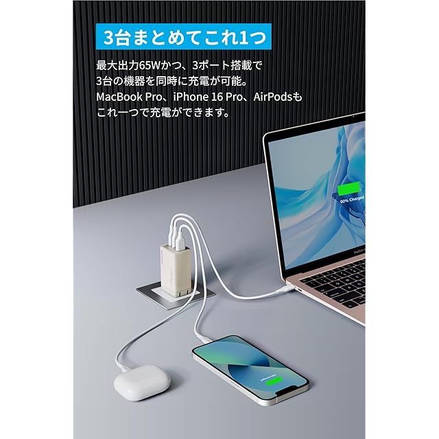 3台まとめてこれ1つ:最大出力65Wかつ、3ポート搭載で3台の機器を同時に充電が可能。MacBook Air、iPhone 15、AirPodsもこれ1つで充電ができます。