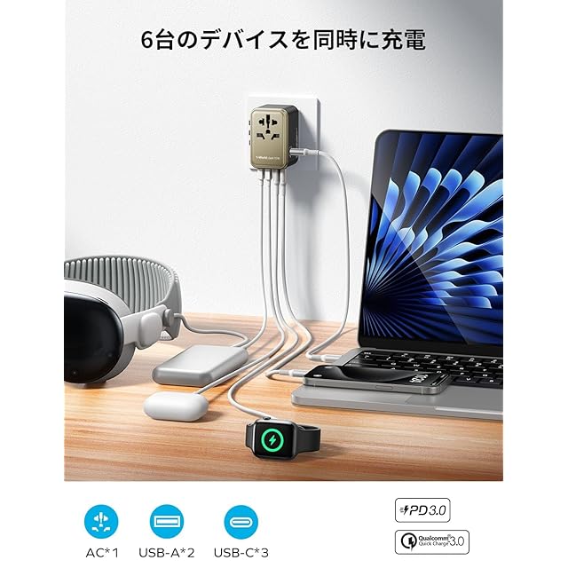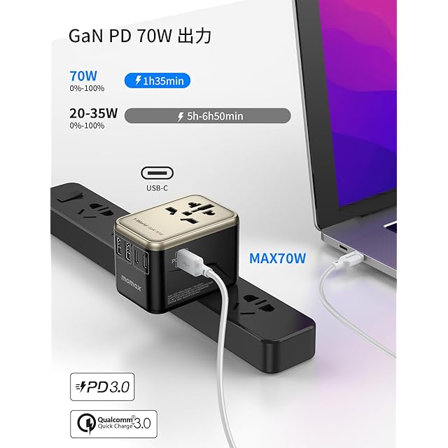 商品名:【70W 急速充電】MOMAX 変換プラグ PD 70W GaN 急速充電 海外旅行用電源変換 6台同時充電 3*USB-C PD & 2*USB-A QC &1*ACコンセント 海外用コンセント C/BF/O/Aタイプ マルチ変換プラグ 全世界対応 ヨーロッパ/韓国/イギリス/アメリカ/オーストラリアなどの国 便利グッズ パソコンに対応