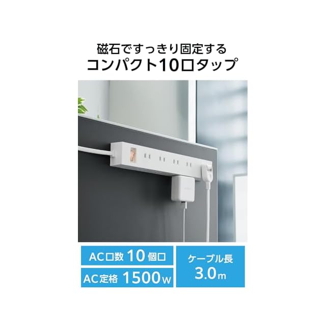 商品名:エレコム 電源タップ 雷ガード 10個口 差し込み口2面 3m マグネット ほこりシャッター付 スイングプラグ 一括スイッチ コンパクト ホワイト ECT-1530WH