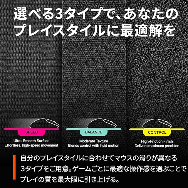 【プロ基準の操作性。勝利を決めるゲーミングマウスパッド】超高密度素材を採用し、プロレベルの繊細なコントロールを実現。プレイに最適な厚さ3.5mm、底面に強力なラバーグリップを採用し、マウスパッドのズレを防止します。プレイスタイルに応じて選べる3タイプをご用意。
