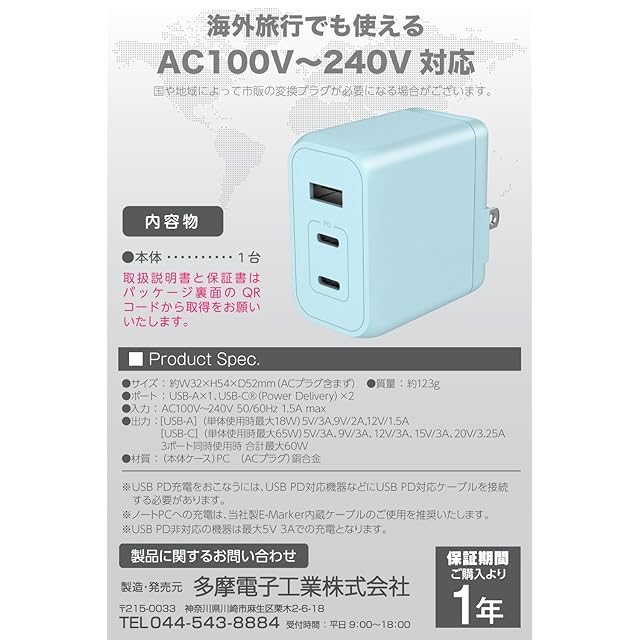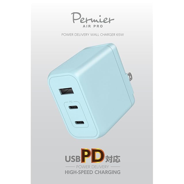 商品名:多摩電子工業 PD65W対応 AC充電器 USB x3ポート装備 (USB-C x2、USB-A x1)折りたたみ式プラグ Permier PR-AP146UC2 急速充電対応 ACアダプター GaN 窒化ガリウム採用 PSE技術基準適合 PPS PD3.0 QC3.0 iPhone15 / 15 plus/15pro/15 Pro max/Android/MacBook対応 (ベビーブルー)