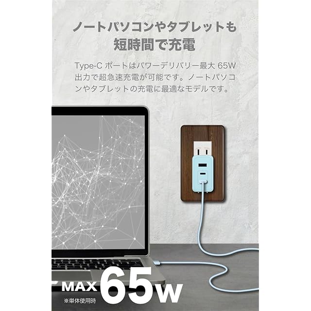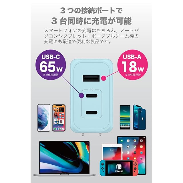超急速充電が可能なPD(USBパワーデリバリー)に対応したコンセント充電器。新素材GaN(窒化ガリウム)を半導体(集積回路)に採用。従来のシリコン半導体に比べ低発熱と小型化を実現。最大出力65W給電でノートパソコン、スマホやタブレット、ゲーム機の充電に最適。Type-Cポート×2とUSB-Aポート×1を搭載。過電流・過電圧保護機能を搭載した安全設計。90°回転式プラグACプラグ採用で収納、持運びに便利。海外でも使用できるAC100V/240V対応。※国や地域によって市販の変換プラグが必要になる場合があります。※本製品に充電用ケーブルは付属されていません。 主な本体仕様 : ●入力:AC100V~240V 50/60Hz 1.5A max ●USBポート仕様 USB-C x 2ポート(PD65W対応)、USB-A x 1ポート ①USB-C1:PD65W(5V/3A,9V/3A,12V/3A,15V/3A,20V/3.25A) ②USB-C2:PD65W(5V/3A,9V/3A,12V/3A,15V/3A,20V/3.25A) ③USB-A1:18W(5V/3A,9V/2A,12V/1.5A) ④USB-C1+C2:PD45W+PD20W ⑤USB-C1+A1:PD45W+18W ⑥USB-C2+A1:15W(5V/3A) ⑦USB-C1+(C2+A1):PD45W+15W(5V/3A)※3ポート同時使用時合計最大60W ●サイズ:約W32×H54×D52mm(ACプラグを含まず)●質量:約123g ●材質:本体ケース PC、ACプラグ 銅合金 ●:1年