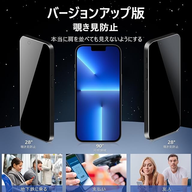 【覗き見防止・プライバシーフィルム】 覗き見防止技術により、左右の視野からの視線を防ぎ、画面のプライバシーを守ります。電車などでも安心のプライバシー保護フィルムです。MINIKAのiPhone13Pro 覗き見防止フィルムは斜めから見るとブラインドルーバーにより画面が真っ黒になりますが、真正面から見ると高透過率ではっきり見ることが出来ます。