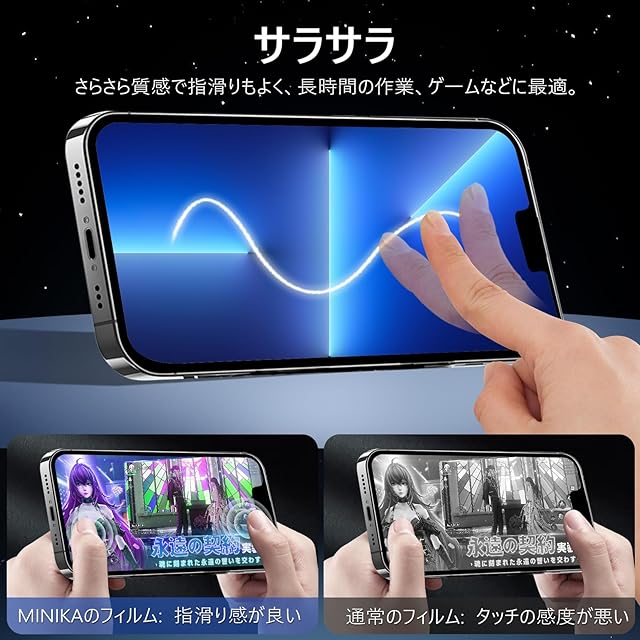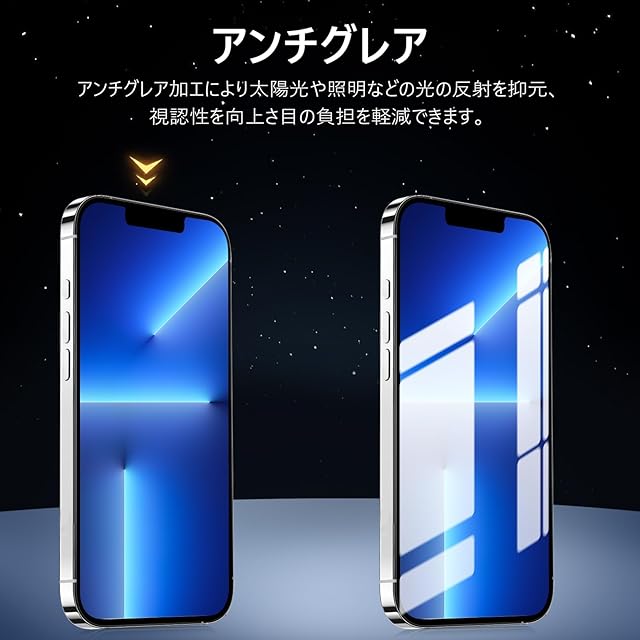 【アンチグレア・指紋防止・高感度タッチ】 アンチグレア(非光沢)タイプのさらさらで快適な操作感。光の反射を軽減し、より目に優しくちらつきを抑えます。同時に、iPhone13 ガラスフィルム には撥油コーティングが施されており、指紋や汚れなどに強くなめらかな操作感を実現、付着した汚れなどは簡単に拭きとれます。こちらは高耐久撥油コーティングが施され、つるつるな滑り感を実現!ゲームをする人におすすめです。