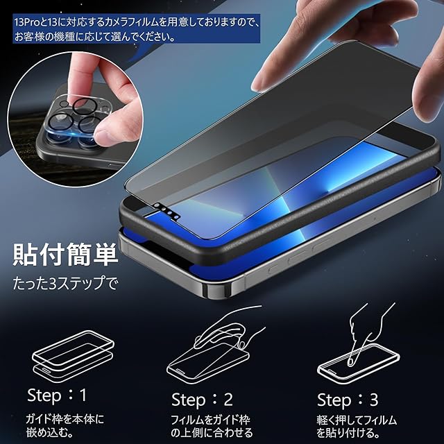 【2in1・多機能】 新技術を取り入れた2in1保護フィルムは、アンチグレア&覗き見防止機能を兼ね備えています。画面操作時の手触りをさらに改良し、より滑らかでサラサラな使い心地を実現しました。 【対応機種】 iPhone13/13Pro 用(6.1インチ対応)。【パッケージ内容】 iPhone13/13Pro ガラスフィルム * 2枚セット + iPhone13/13Pro カメラフィルム * 2枚セット + ガイド枠 * 1枚。