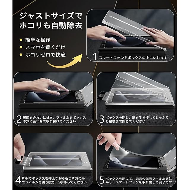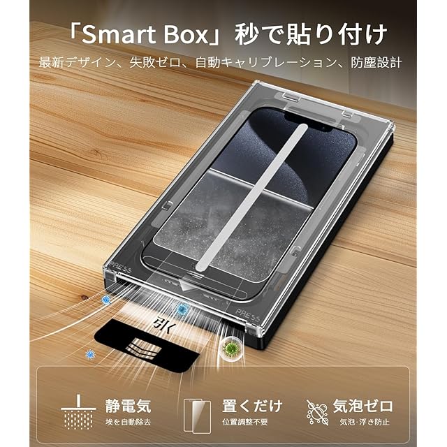 【最新なフィルム貼り付けデザイン・2ステップで簡単に貼り付け】MINIKA iPhone 15Promax ガラスフィルム の画期的なバリ楽BOX。このボックスには自動位置決め機能を搭載し、埃や気泡が埃除去フィルムを剥がした直後に即座に排出されます。iPhone15Promaxをボックスに入れ、いPhone15Promax ガラスフィルム をフレームにセットし、ガイドテープを引き出すだけで、素早くずれずに取り付け可能です。