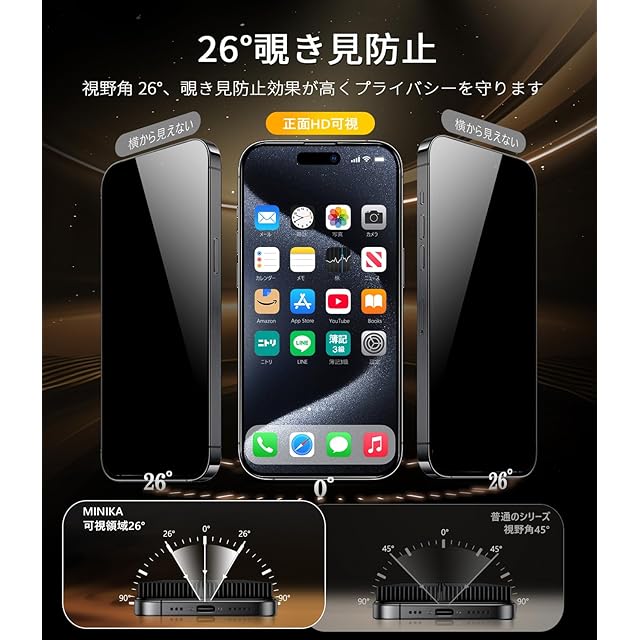 商品名:MINIKA iPhone 15 Pro Max ガラスフィルム 覗き見防止 + アンチグレア 2in1 いPhone15Pro max フィルム のぞき見防止 さらさら アイフォン15Promax 保護フィルム プライバシー 横から見えない 指紋防止 一体式ガイド枠付き 超簡単貼り付け 自動位置決め iPhone15プロマックス カメラフィルム 付き「2枚セット」