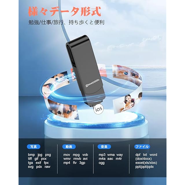 PHICOOL 4in1 USBメモリ 256GB【完全アプリ不要】から直接保存 外付けストレージ ▼3秒で始まるスマート生活 phoneのアルバムを開く→保存したい写真を選択→「USBへ転送」をタップ。 これだけで瞬時にデータ保存!クラウドサービスの月額費もWi-Fi環境も不要。 ▼2024年最新モデル完全対応 └ 16 Pro Max/16シリーズ~ 8まで全世代対応 └pad Pro(M2チップ搭載機種)/MacBook Air 15インチ等最新端末でも安定動作 └Type-C××USB3.0×MicroUSBの4WAY接続 ▼PHICOOLだけの5大革新 軍事級保護:航空アルミニウム合金ケース+内部緩衝材で2m落下耐性 超直感設計:カラー図解マニュアル+動画サポート(日本語専任スタッフ常駐) 潔癖症対応:抗菌加工ライトニングキャップ(99.9%菌繁殖抑制) 完全静音:無駄なLEDランプ廃止で会議中も安心使用 和風美学:桜模様刻印の収納ポーチ付属 ▼こんな方に必需品 ✓「Cloudの課金を解約したい」 ✓「孫の動画でスマホがパンク寸前」 ✓「機種変更時のデータ移行が面倒」 ✓「ビジネスデータの物理バックアップが必要」 ▼仕様詳細 ・転送速度:HD動画1GB約12秒 ・対応形式:HEIC/RAW/MP4/PDF等37種 ・動作環境:-20℃~60℃(雪山旅行でも問題なし) ・サイズ:親指サイズ(5.8×1.4cm) ・重量:ストラップ付きでも3.5g
