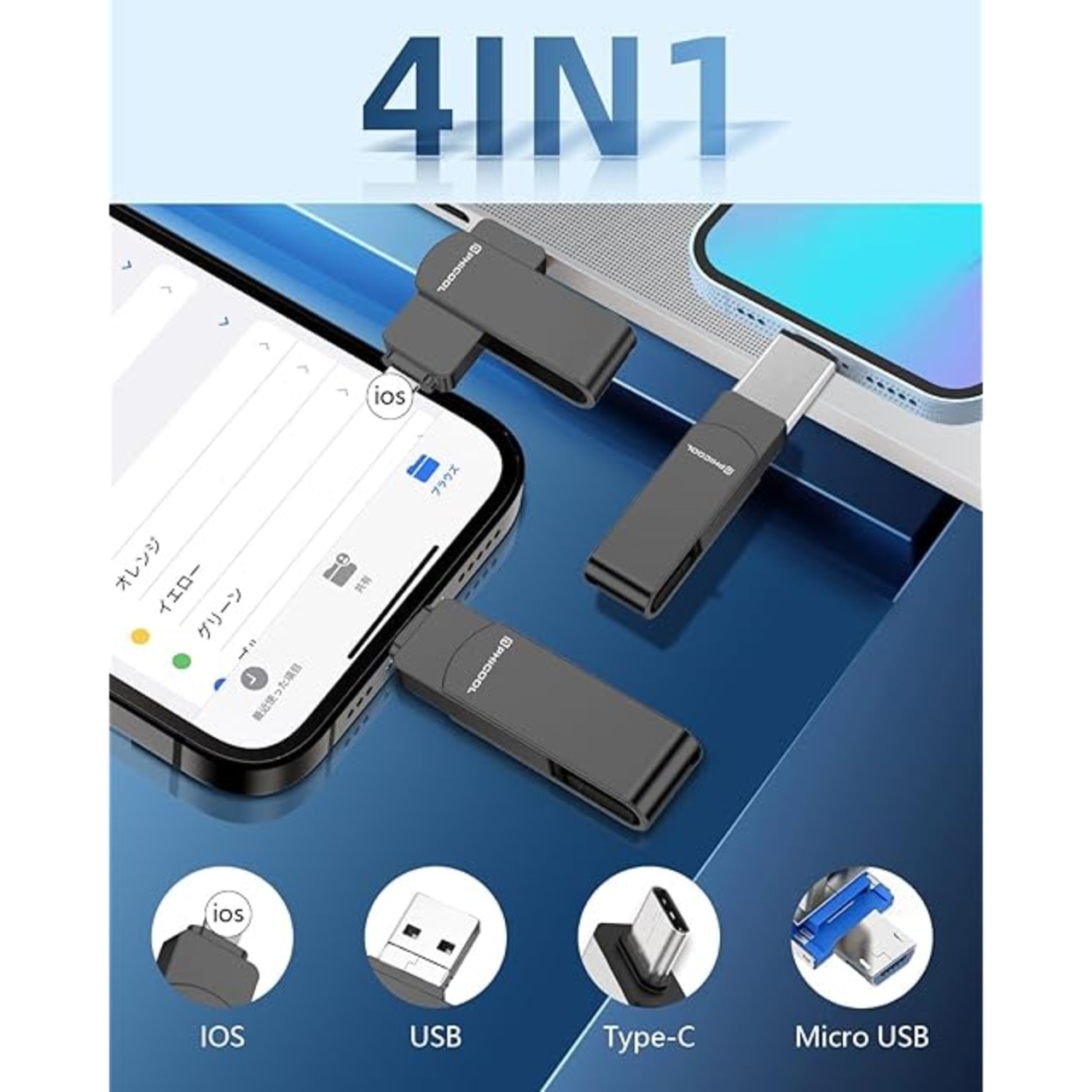【最新4in1設計】/USB-C/USB3.0/MicroUSBの4in1端子を搭載。16Pro Max/16シリーズはもちろん、最新MacBook Pro(M3チップ搭載)まで幅広く対応。usbメモリ タイプc端子はUSB3.0 Gen1規格で最大転送速度を実現。 usbメモリ phone対応はPhone16/15/ 14 /13/12 /SE /11/XR/XS Max/XS /X /8 Plus/8/Pad Air(第1/2/3世代)/ MacBook(Pro/Air)/pad mini(第1/2/3/4/5世代)/Pad(第5/6/7/8/9世代)アイフォン全シリーズ/ パソコン/ Type-Cスマホ/ Androidスマホ /タブレットなどとデータ移行 互換性のあるusbメモリ。