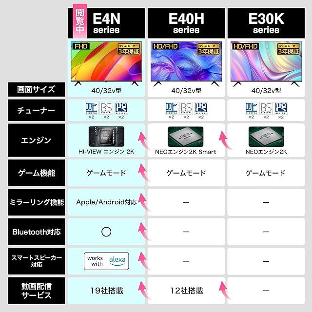商品名:ハイセンス 40V型 40E4N フルハイビジョン 液晶 テレビ ネット動画 ダブルチューナー 外付けHDD 裏番組録画 Alexa ゲームモード AirPlay2 Bluetooth 3年 2024年モデル