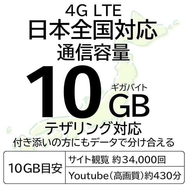 【docomo回線による安定通信】プリペイドSIMの有効期限内であれば、docomo の 4G LTE 高速データ容量10GBまで使えます。利用エリアや速度は安定、テザリング利用も可能です。