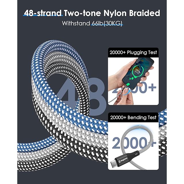 高耐久48番手二重ナイロン、3次元編み込み技術:Magtameタイプシーケーブルは高耐久48番手の二重ナイロン4層構造を高密度編組で耐久力に強化しています。更に3次元の編み込み技術により断裂を防ぐタイプcタイプcです。
