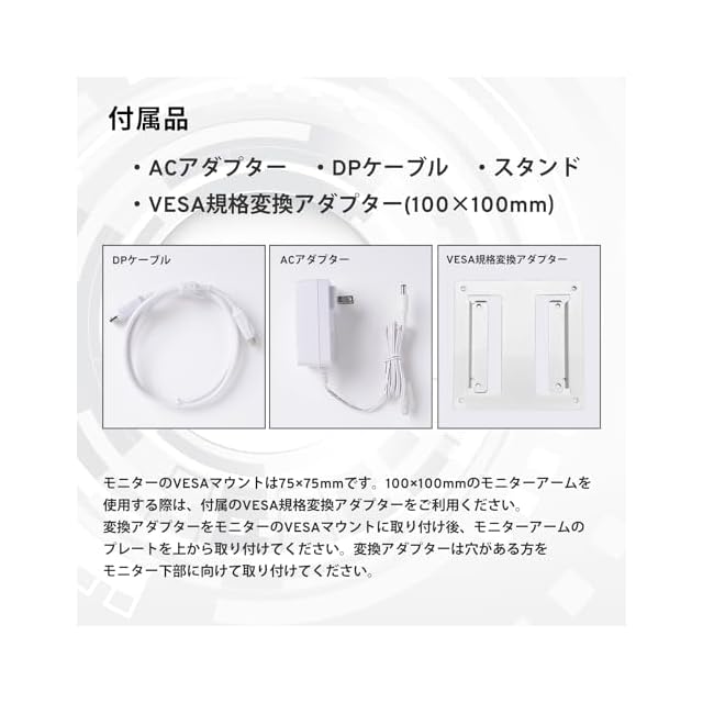 【機能】 AMD FreeSync Premium / G-SYNC compatible / HDR10 / Flicker Free / VESAマウント(75mm) / ブルーライトカット / Overdrive / Black Equalizer / スピーカー内蔵 (3W×2)