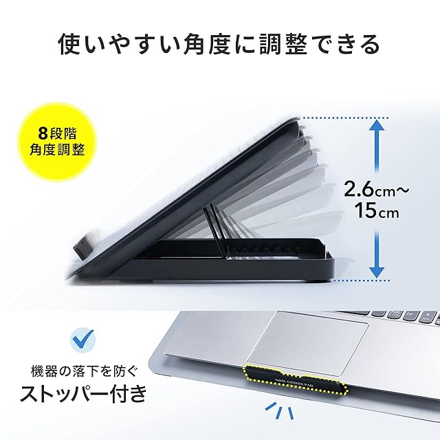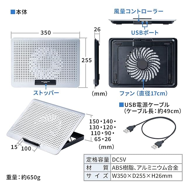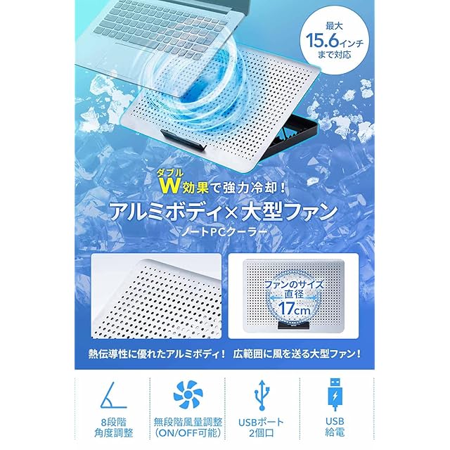 商品名:サンワダイレクト ノートパソコンクーラー 冷却台 アルミ 15.6インチ対応 静音 角度8段階 風量無段階 USB2ポート USB給電 400-CLN031