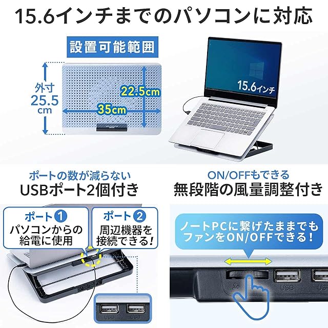 冷却面のサイズは幅35×奥行22.5cmです。最大15.6インチ程度までの様々なサイズのノートパソコンやタブレット等にも使用できます。