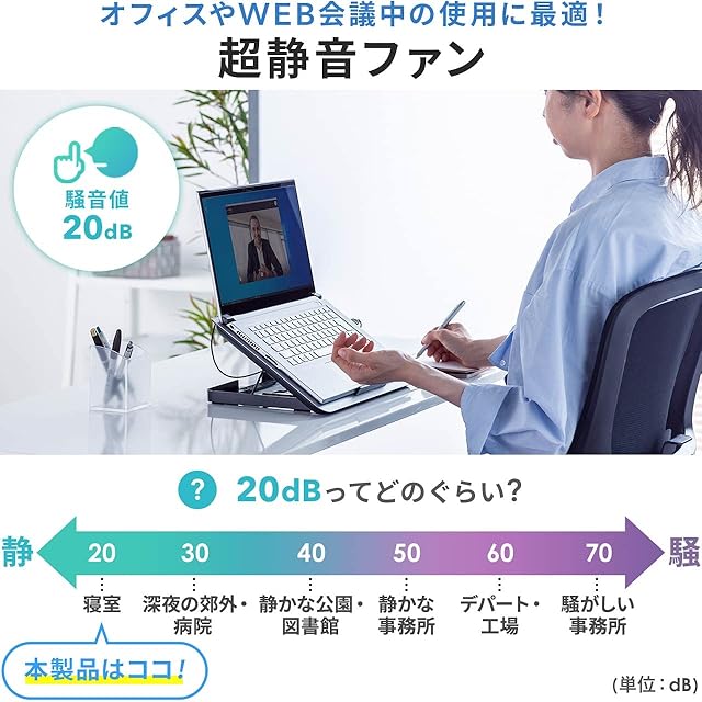 1ポートは本製品への電源供給用で、ノートパソコンから給電できます。もう1ポートにはUSBメモリやマウスなどを接続して使用できます。ファン稼働時でも騒音値は20dBで、パソコン作業の邪魔になりにくいです。