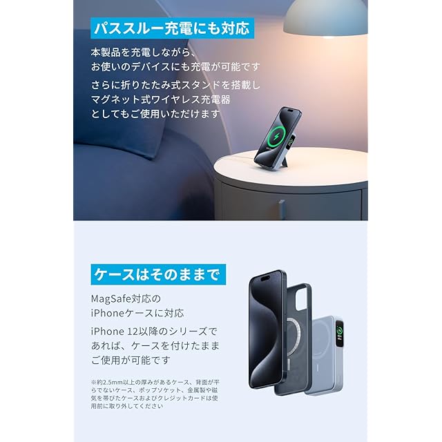 パススルー充電にも対応:本製品を充電しながら、お使いのデバイスにも充電が可能です。さらに折りたたみ式スタンドを搭載し、マグネット式ワイヤレス充電器としてもご使用いただけます。