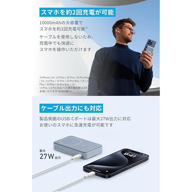 スマホを約2回充電が可能:10000mAhの大容量で、スマホを約2回充電が可能です。ケーブルを使用しないため、充電中でも快適にスマホを操作いただけます。