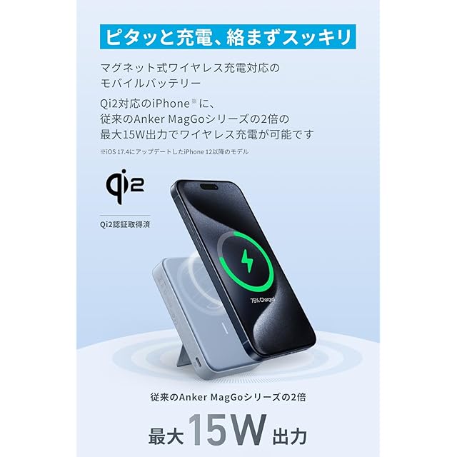 ピタッと充電、絡まずスッキリ:マグネット式ワイヤレス充電対応のモバイルバッテリー。Qi2対応のiPhone等に従来のAnker MagGoシリーズの2倍の最大15W出力でワイヤレス充電が可能です。