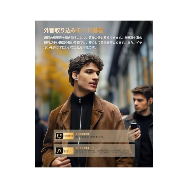 【極めて快適な装着感】三点で均等に力を分散するデザインを採用し、長時間の装着でも聞き疲れや蒸れを感じず、わずか4gの軽量デザインにより、長時間の音楽リスニングもストレスフリーで圧迫感を最小限に抑え、快適にご使用いただきます。便利な装着検出機能を搭載しており、耳から外すと一時停止、耳に着けると再生します。【マルチポイントペアリング】同時に2台の機器と接続することが可能です。また、Bluetooth接続を都度切り替える必要がなく、スマホで音楽、PCでWEB会議などの使い分けをスムーズに行うことができます。外音取り込みモードに切り替えると、友人との会話や公共施設のアナウンス等の外音を取り込みながら音楽を楽しむことが可能です。