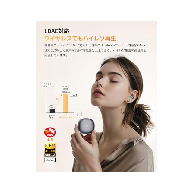 【未体験レベルの音質】MeloBuds Proワイヤレスイヤフォンは高音質ゴーデックLDACに対応し、従来のBluetoothコーデック技術であるSBCと比較し、最大約3倍の情報量を送信することが可能なため、ワイヤレス接続でも原音に近いクリアな音楽を再現。また、日本オーディオ協会 (JAS)からハイレゾオーディオ&ハイレゾワイヤレス認証も取得しました。QCY独自の空間オーディオアルゴリズムと、弾力性のある12mm大口径ダイナミックドライバーにより、空間全体を包み込むような立体音響を実現しました。まるでコンサート会場でVIP席に座ったかのようにリスニング体験をお楽しめます。