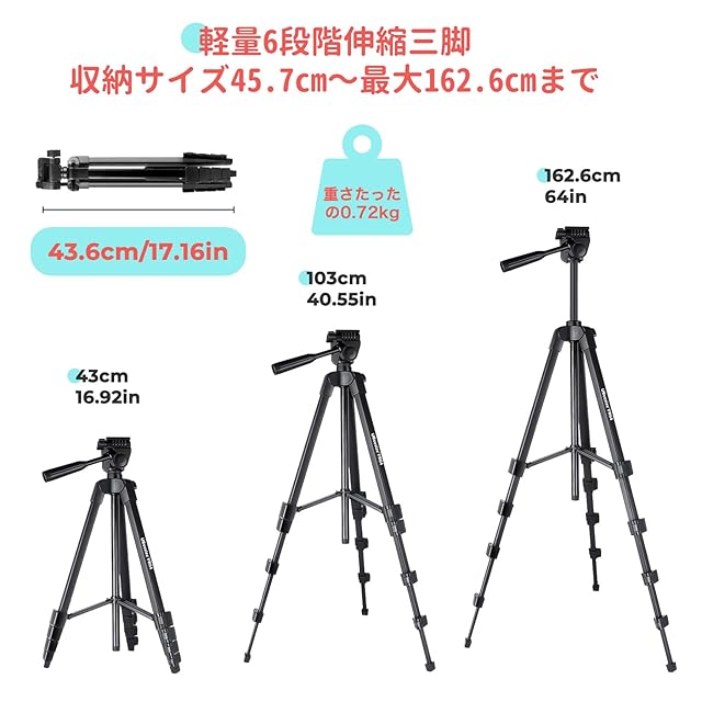 【軽量デザイン・スマホ/カメラ多用途】ビデオカメラ三脚は重さわずか0.55kg、持ち運び便利で、初心者でも簡単に取り付けます。デジタルカメラ、アクションカメラ、GoPro、ネットワークカメラ、カメラ、canon、Nikon、オリンパス、スマホなどの撮影設備に適用できます。
