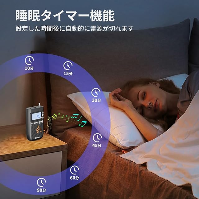 【便利な睡眠タイマー】お気に入りの放送局や音楽を聴きながら眠りにつけます。睡眠タイマーを90分、60分、45分、30分、15分、または10分後に自動でオフに設定することで、一晩中安心して眠ることができ、バッテリー切れの心配がありません。※ご注意:このラジオには多くの機能があるので、使用前に取扱説明書をよくお読みください。