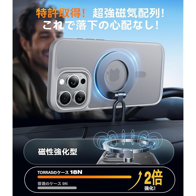 【本当!? 特許取得のマグネット!これが驚異の安定性!】軽く吸着し、瞬時に強力かつ精密にフィットする!TORRAS特許技術に基づく N52 マグネットは最適な配列で設計されており、他のケース磁石と比べて 40%も強い。ワイヤレス充電から車載ホルダーまで、幅広いMagSafe アクセサリーと簡単に互換性がある。どんな揺れにも強く、しっかり固定されるから、簡単には外れない!対応機種:iPhone 16 pro max 用 ケース