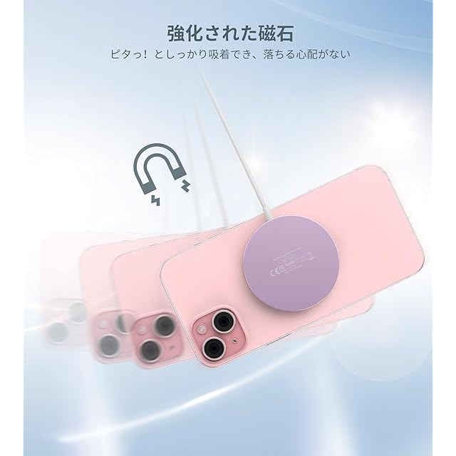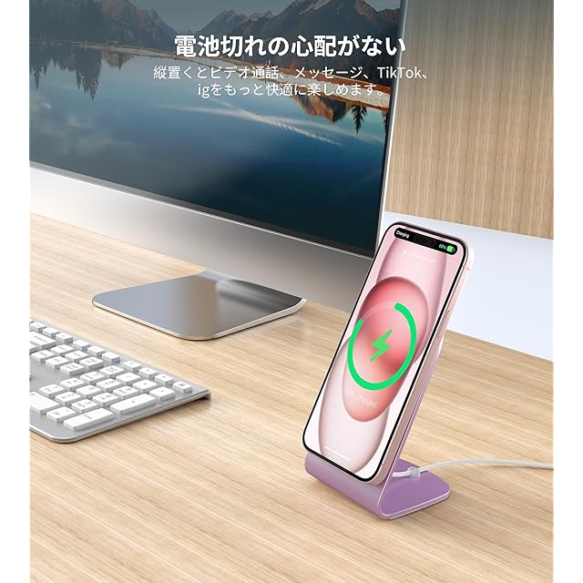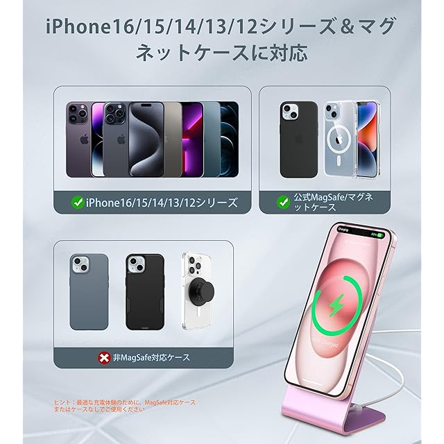 【優れた安全保護・効率的に急速充電】iPhone16/15 /14/13/12を0から100%まで2〜3時間で充電できます。アップル社のワイヤレス充電器とほぼ同じな時間がかかります。インテリジェントETL認定チップの安全保護システムは、過充電、過電流、過電圧、過熱、およびショートを防止します。アルミニウム合金の金属本体で、急速充電中にも熱を迅速に発散できます。