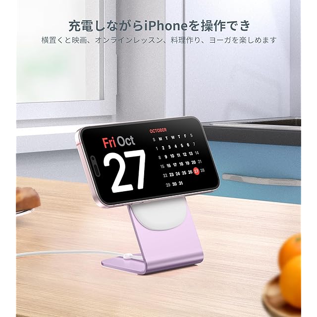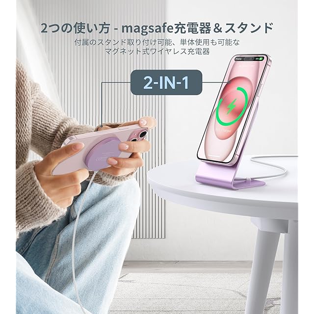 【ワイヤレス充電パッドとマグセーフ充電スタンドを切り替えられる】付属のスタンドは、同梱のmagsafe充電器を取り付け・取り外し可能です。取り付けるとマグネット式スタンドとして使用でき、強力な磁力でしっかり吸着し、落下の心配がありません。自宅・オフィス・テレワークに最適です。取り外せば充電パッドとして単体で使え、ピタッと正確に吸着するため、ズレなく高効率に充電できます。
