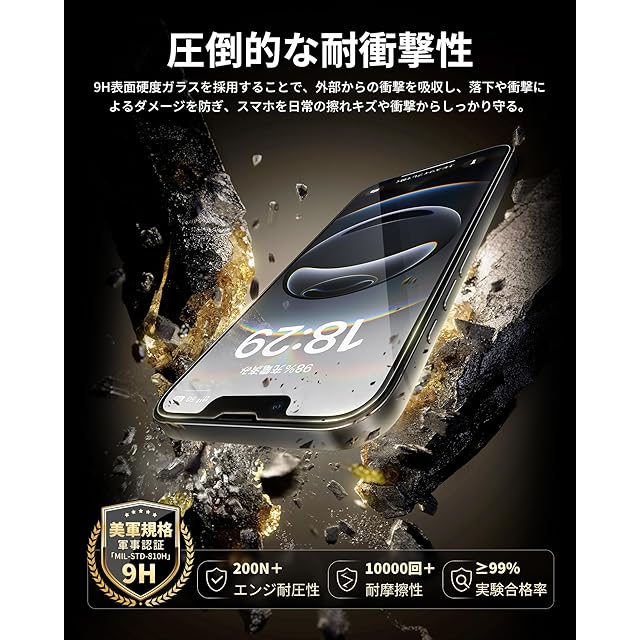 「全面保護」米軍規格「MIL-STD-810H」に準拠(認証番号:SZXEC23002005001)の9H硬度ガラスを採用、鍵などの硬く鋭いものにぶつかっても傷が付きにくく、落下などの衝撃も最小限に抑えられ、あいふぉん 16e/14/13 pro/13の画面をしっかり保護できます。