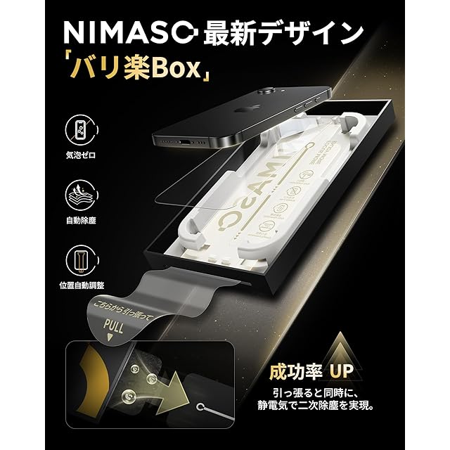 「たったの2ステップ・一瞬でズレがなく貼れる」NIMASO最新デザインのバリ楽Boxさえあれば、簡単に貼り付けができます。バリ楽Boxには正確な位置決め装置が搭載されており、アイフォン 16E/14/13 pro/13の画面にぴったり合うようにフィルムが配置されています。これにより、iPhone 16e/14/13 pro/13 のスクリーンを下に向けて、ボックス中に入れて引っ張るだけで、誰でも位置ズレなく貼り付けが可能です。