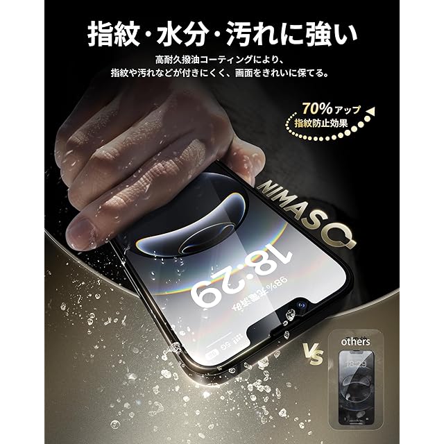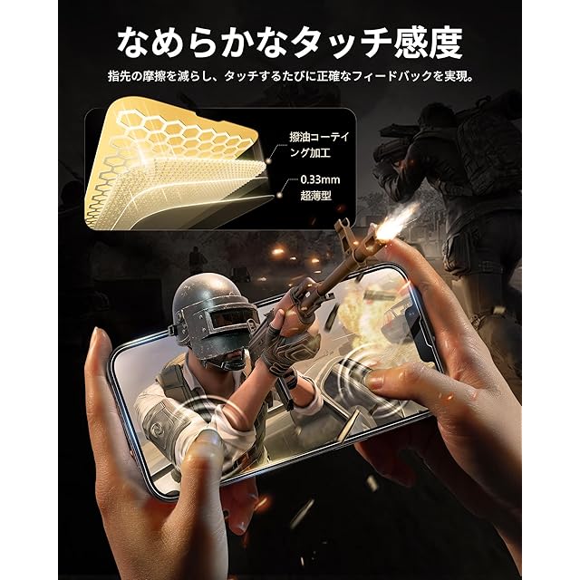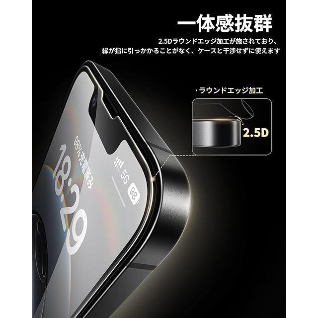 「99%の透明感・指紋防止」このいphone 16e/14/13 pro/13用フィルムは99%という高い透過率を持つ極薄ガラス材料で、画面の精細さを保ちながら、滑るようなスムーズなタッチ操作を体感できます。また、撥水撥油のAF(Anti-Fingerprint)コーディング加工により、指紋がつきにくく、汚れや油分をはじき、着いても拭き取るだけで綺麗になります。