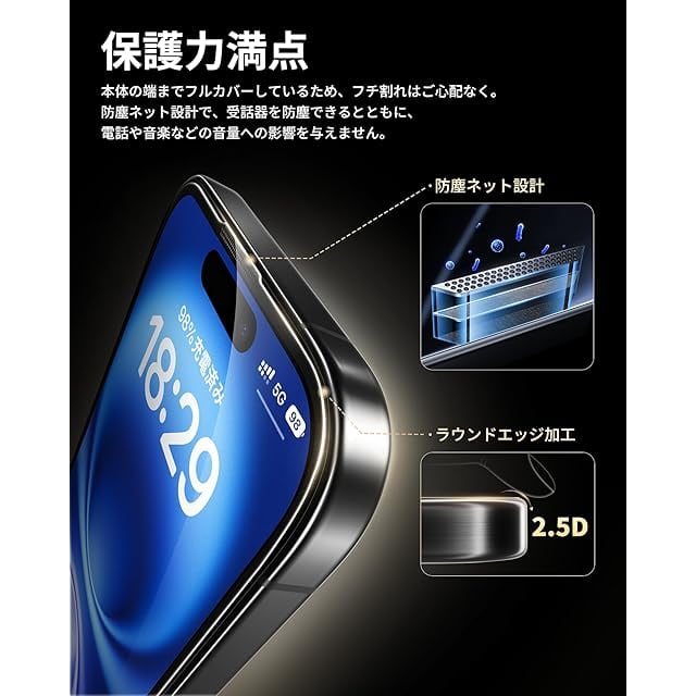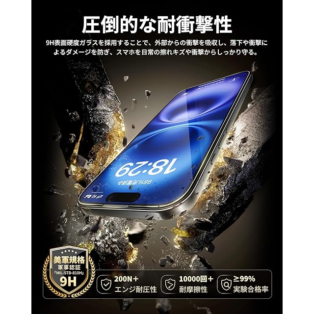 「優れた保護力・防塵ネット付き」米軍規格「MIL-STD-810H」に準拠(認証番号:SZXEC23002005001)の9H硬度ガラスを採用、鍵などの硬く鋭いものにぶつかっても傷が付きにくく、落下などの衝撃も最小限に抑えられ、あいふぉん16の画面をしっかり保護できます。その上、極細黒縁で画面の端まで全面保護しているので、フチ割れともおさらば。また、防塵ネットのデザインなので、ホコリの付着を防止しつつ、スピーカーの音質に影響は与えません。