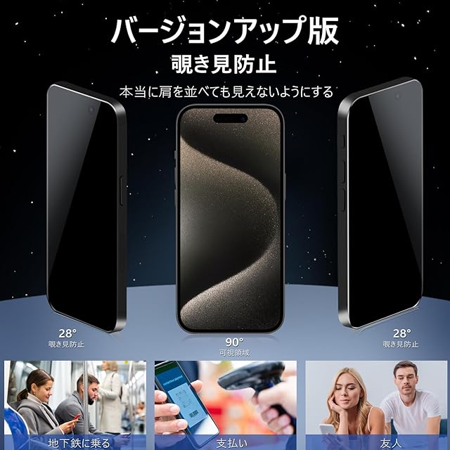 【覗き見防止・プライバシーフィルム】 覗き見防止技術により、左右の視野からの視線を防ぎ、画面のプライバシーを守ります。電車などでも安心のプライバシー保護フィルムです。MINIKAのiPhone15Promax 覗き見防止フィルムは斜めから見るとブラインドルーバーにより画面が真っ黒になりますが、真正面から見ると高透過率ではっきり見ることが出来ます。