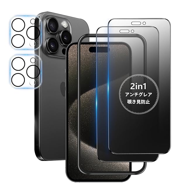 【覗き見防止 + アンチグレア / 2枚セット】 iPhone 15 Pro max ガラスフィルム 覗き見 さらさら いPhone15Promax 保護フィルム サラサラ アイフォン15プロマックス 覗き見防止フィルム 指紋防止 iPhone15Promax カメラフィルム 付き