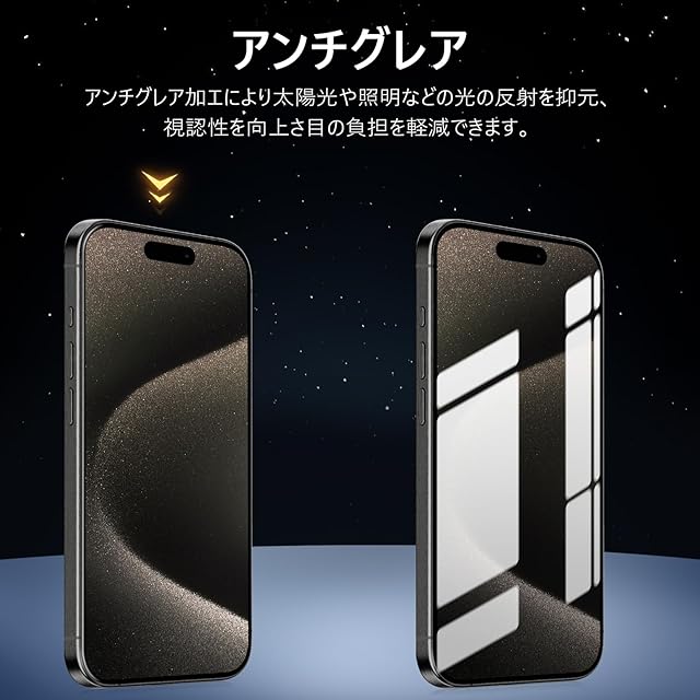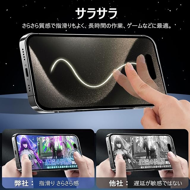 【アンチグレア・指紋防止・高感度タッチ】 アンチグレア(非光沢)タイプのさらさらで快適な操作感。光の反射を軽減し、より目に優しくちらつきを抑えます。同時に、iPhone15プロマックス ガラスフィルムには撥油コーティングが施されており、指紋や汚れなどに強くなめらかな操作感を実現、付着した汚れなどは簡単に拭きとれます。こちらは高耐久撥油コーティングが施され、つるつるな滑り感を実現!ゲームをする人におすすめです。