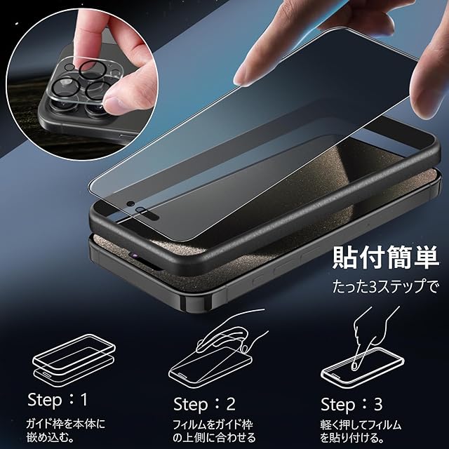 【ガイド枠付き・貼付け簡単】 ガイド枠をはめる→上側に合わせて、 いPhone15Pro max ガラスフィルムを置く→軽く押すだけで自然に吸着。 フィルム貼りことが苦手の方でも簡単に貼る事が可能です。また、縁にラウンドエッジ加工が施されており、iPhone本体の縁に適度なスペースを残すデザインとなっており、フィルムの剥がれや浮き上がりを防止し、スマホケースと干渉せずに快適に使えます。