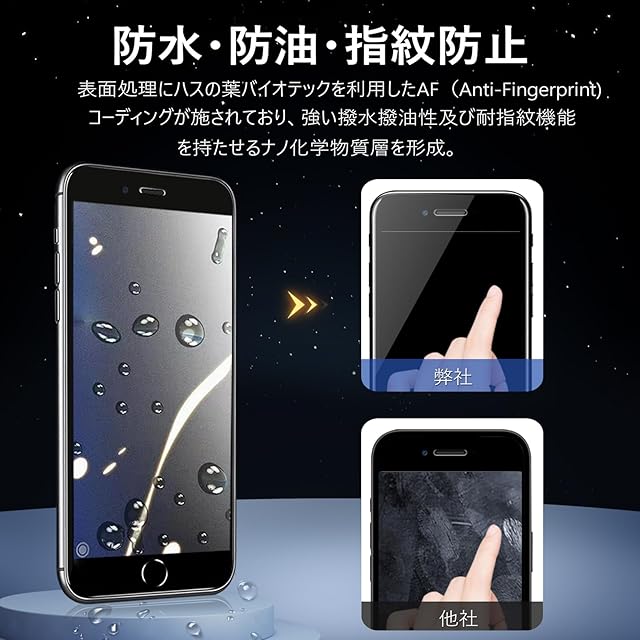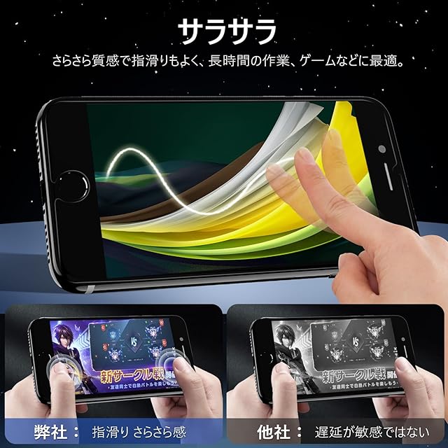 【アンチグレア・指紋防止・高感度タッチ】 アンチグレア(非光沢)タイプのさらさらで快適な操作感。光の反射を軽減し、より目に優しくちらつきを抑えます。同時に、iPhone SE3 フィルム には撥油コーティングが施されており、指紋や汚れなどに強くなめらかな操作感を実現、付着した汚れなどは簡単に拭きとれます。こちらは高耐久撥油コーティングが施され、つるつるな滑り感を実現!ゲームをする人におすすめです。