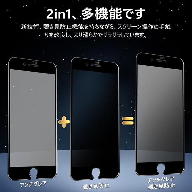 【2in1・多機能】 新技術を取り入れた2in1保護フィルムは、アンチグレア&覗き見防止機能を兼ね備えています。画面操作時の手触りをさらに改良し、より滑らかでサラサラな使い心地を実現しました。 【対応機種】 iPhoneSE2(2020) / iPhoneSE3(2022)用(4.7インチ対応)。【パッケージ内容】 iPhoneSE2/SE3 ガラスフィルム * 2枚セット + ガイド枠 * 1枚。