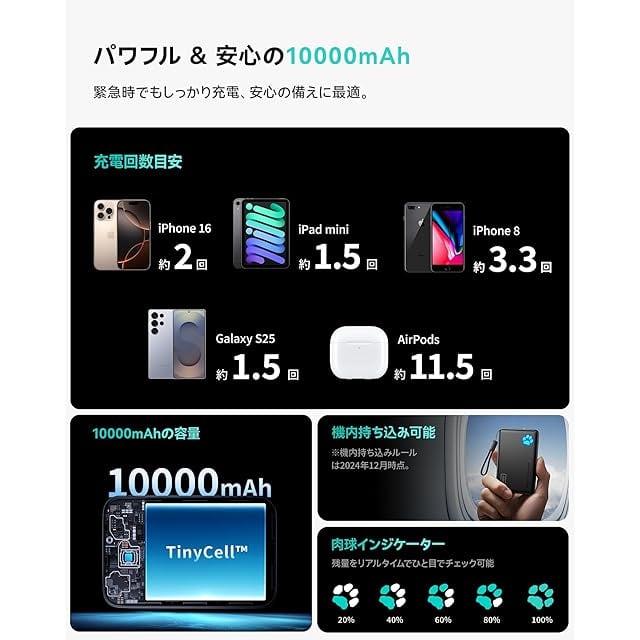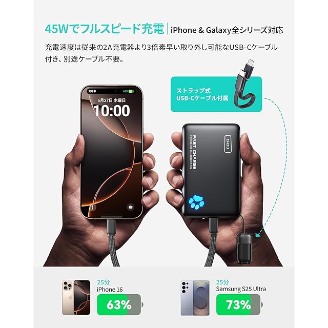 <p>【INIU・安全な急速充電プロ】世界中で3,800万人以上にご愛用いただいている、安全性に配慮した充電体験をお届けします。INIUの充電製品は厳格な安全基準に従い、全製品に業界をリードする3年間の品質サービスを提供しています。</p> <p>【45Wフルスピード充電 – 最新iPhone 16 & Galaxy S24対応】最大45Wの出力でPD、QCなどの高速充電プロトコルに対応。わずか25分でiPhone 16を63%、Galaxy S24 Ultraを驚異の73%まで充電可能です。</p> <p>【業界初!高密度TinyCell】INIUの最新10,000mAhモバイルバッテリーは、市場初の高密度セルを採用しており、同容量の他製品に比べて約30%コンパクト、15%軽量化を実現しました。</p> <p>【丈夫なナイロン製ストラップ付USB-Cケーブル】INIU独自開発の丈夫なナイロン編み込みUSB-C to Cケーブルが付属。プラスチック製ケーブルよりもはるかに長持ちします。充電ケーブルを忘れる心配はもうありません。この1本で本体の充電も、デバイスの充電も可能です。</p> <p>【3台同時充電】2つのUSB-Cポートと1つのUSB-Aポートを搭載し、緊急時に3台のデバイスを同時に充電できます。</p> <p>【パッケージ内容】INIU 10,000mAhモバイルバッテリー×1、ストラップ式 USB-C ケーブル (USB-C to C)×1、ユーザーマニュアル(日本語付き)×1、30日間の返金、3年間の品質及びライフタイムテクニカルサポート。</p>